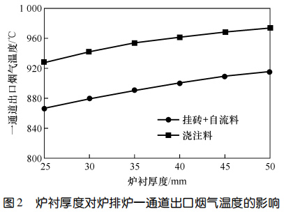 2、對于掛磚+自流料爐襯,掛磚厚度不變時(shí),自流料厚度越大,一通道出口煙氣溫度越高;爐襯總厚度不變時(shí),掛磚越厚、自流料層越薄,一通道出口煙氣溫度越低;爐襯各工作層厚度固定時(shí),一通道出口煙氣溫度隨自流料熱導(dǎo)率的升高而降低,通過調(diào)整自流料熱導(dǎo)率,一通道出口煙溫差值可達(dá) 70 ℃。