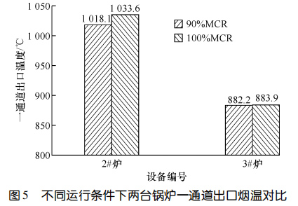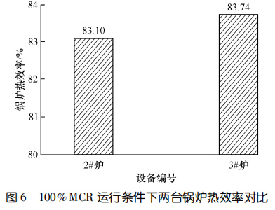 兩臺設(shè)備運(yùn)行 11 個(gè)月后進(jìn)行了能效測試。圖5對比了 90%鍋爐大的連續(xù)蒸發(fā)量(簡稱 MCR)和100%MCR 條件下鍋爐一通道的出口煙溫。圖6示出了100%MCR運(yùn)行條件下兩臺鍋爐熱效率的對比。結(jié)果顯示:在 90%MCR 運(yùn)行條件下,3#爐一通道出口煙溫比2#爐低 135.9 ℃,在100%MCR 運(yùn)行條件下,3#爐一通道出口煙溫比 2#爐低 149.7 ℃,3#爐的熱效率比 2#爐高 0.64%。相較而言,使用膜式壁爐襯的3#爐在負(fù)荷相當(dāng)?shù)那闆r下,余熱鍋爐熱效率更高。
