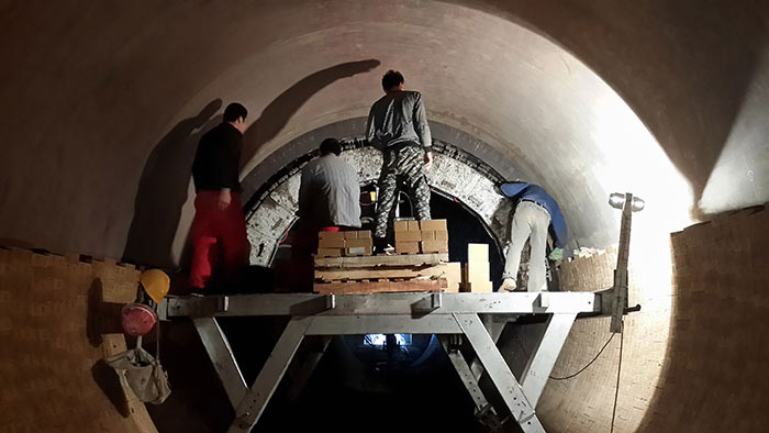 窯拱圈更后一塊楔入的磚對(duì)于一個(gè)排列緊密穩(wěn)定的圓拱圈至關(guān)重要,其被稱之為鎖磚。鎖磚須使其兩個(gè)斜面與兩側(cè)的耐火磚斜面完全吻合,毫無(wú)間隙地充滿預(yù)留的空間。