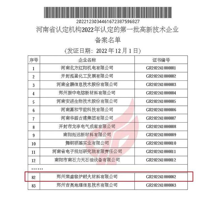發(fā)布時間:2023/2/2 16:55:21 點擊率: 來源:高鋁磚廠家 作者:榮盛耐材近日,高新技術(shù)企業(yè)認定管理工作領(lǐng)導小組辦公室發(fā)布了《關(guān)于對河南省認定機構(gòu)2022年認定的一批高新技術(shù)企業(yè)進行備案的公告》。由多個部門審核推薦,經(jīng)專家評審,鄭州榮盛窯爐耐火材料有限公司通過2022年度“國家高新技術(shù)企業(yè)”復(fù)審。此次是2019年公司初次獲得國家高新技術(shù)企業(yè)以來,再次被復(fù)審認定為國家高新技術(shù)企業(yè)。