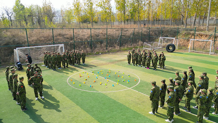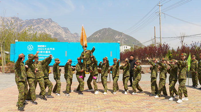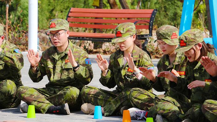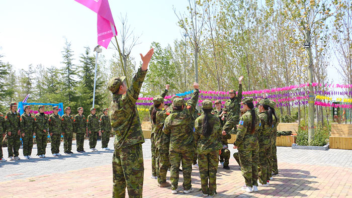 開訓(xùn)前,在破冰啟航環(huán)節(jié)——【智勇通關(guān)】項目中,每組選一個大魔王來防守別隊,該隊隊員依次挑戰(zhàn)大魔王,石頭剪刀布定輸贏,贏了直接通過,輸了轉(zhuǎn)一圈,回來接著挑戰(zhàn),再輸即增加圈數(shù),直到全部隊員通過。大家把團(tuán)隊當(dāng)成了自己的“城堡”,在“對抗魔王”中,每個隊員都拼盡全力,期待被幸運(yùn)女神光顧,期待團(tuán)隊能盡早完成任務(wù),大家的歡笑聲、喝彩聲灑滿了訓(xùn)練場。