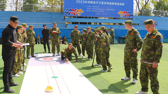 在【旱地冰壺】項目中,八個小組的隊員們一邊商榷對敵戰(zhàn)術(shù),一邊進(jìn)行任務(wù)分配。隨著一聲哨響,兩個賽隊同時開賽。隊員們?nèi)褙炞ⅰ⒛耢o氣,向前邁步?jīng)_刺,揮動手臂擲壺,冰壺按照隊員們設(shè)想的路線擊打到對方的冰壺,使其滑出得分圈并穩(wěn)穩(wěn)地停留在中心點,成功得分,大家歡呼雀躍,圍觀隊員們也紛紛叫好,掌聲、歡呼聲此起彼伏,好不熱鬧。