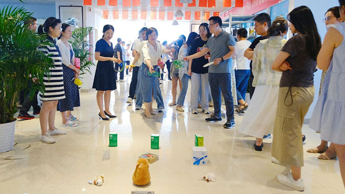 接著近半年入職的小伙伴們輪流登臺做自我介紹,并分隊(duì)開始進(jìn)行丟沙包。這邊用力擲出,那邊左閃右避,不時做出高難度跳躍動作。觀眾們的加油聲高過一陣又一陣,現(xiàn)場洋溢著青春活力氛圍。