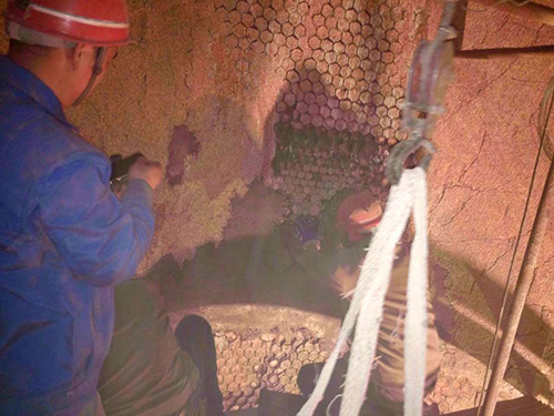 榮盛葛洲壩水泥廠預(yù)熱發(fā)電煙道耐火材料砌筑工程,以上是施工現(xiàn)場(chǎng)