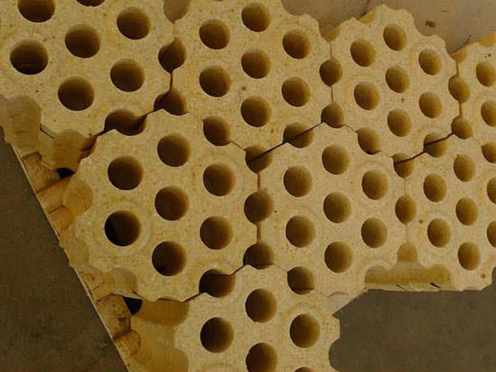 格子磚主要用在熱風(fēng)爐上,當(dāng)熱風(fēng)低于900℃時,一般選用粘土磚;當(dāng)風(fēng)溫高于900℃時,格子磚則采用高鋁磚、莫來石磚、硅線石磚和硅磚等。